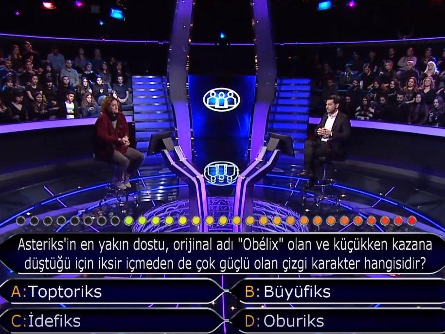 Kim Milyoner Olmak İster'de az önce sorulan soru izleyenleri televizyon ekranlarına kilitledi. Dünyanın en çok izlenen bilgi ve kültür yarışması Kim Milyoner Olmak İster yeni bölümüyle seyirci ile buluştu. Yarışmada sorulan Asteriks'in en yakın dostu, orjinal adı Obelix olan ve küçükken kazana düştüğü için iksir içmeden de güçlü olan çizgi karakterin adı? merak konusu oldu. İşte zorlu sorunun cevabı...