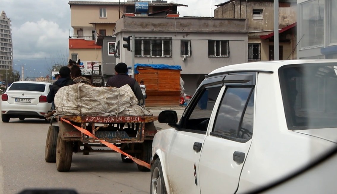 Adana'da yasak olmasına rağmen at arabasıyla yük taşıyan hurdacılar, arızalı otomobili de halatla bağladıkları ata çektirdi. Hurdacılar, arkasına otomobil bağlı at arabasıyla kırmızı ışıkta da durmadı.