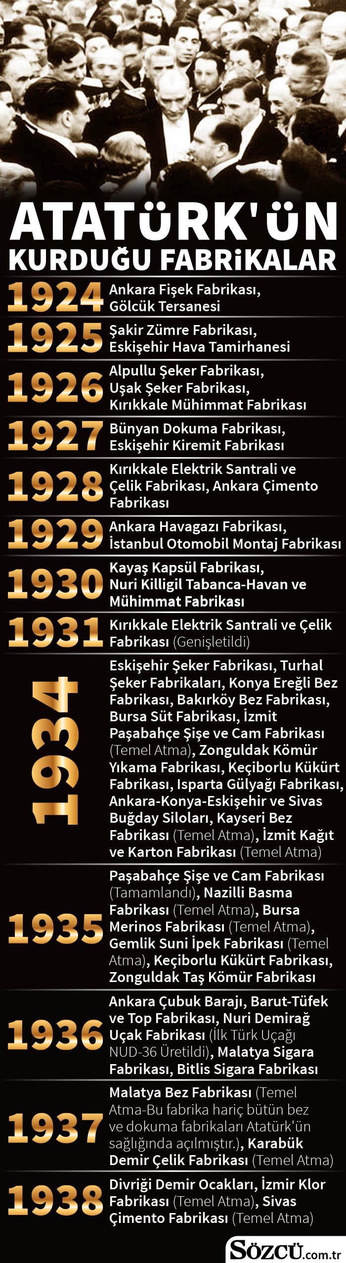 Cumhuriyet kurulduğunda sanayi kuruluşlarının sayısı 386’ydı. Atatürk sayesinde rakam 10 yılda 1087’ye çıktı... “Dışarıdan aldıklarımızı şimdi kendimiz yapıyoruz” sloganı esastı...