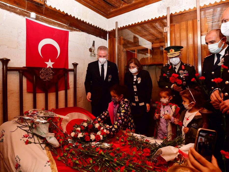 Ardından Atatürk’ün nüfusa kaydolduğu yer olan Bey Mahallesi’ndeki Atatürk Anı Müzesi ziyaret edildi. Burada protokol ve çocuklar tarafından Atatürk’ün bayraklarla süslenen istirahat yattığı yatağa karanfiller koyuldu.