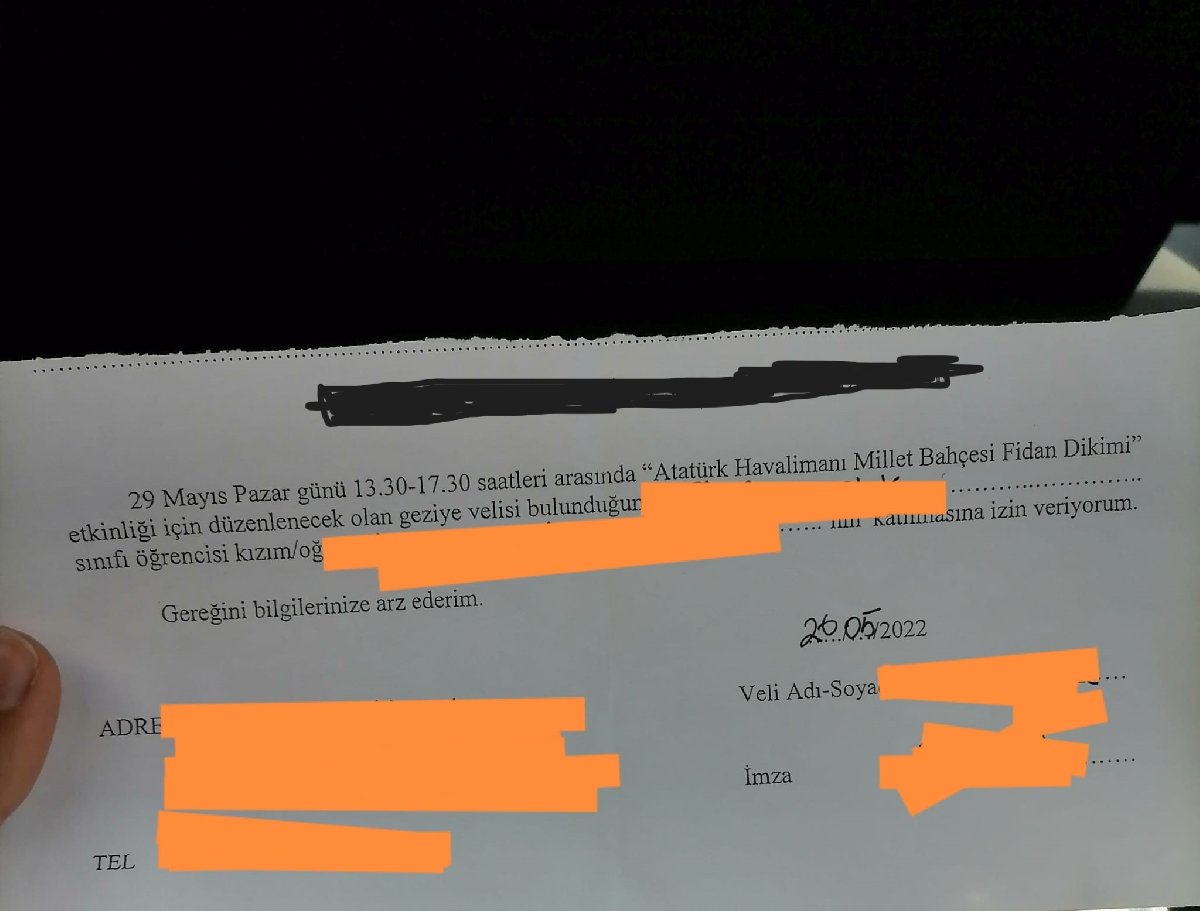 Bugün (Cuma) okul idaresine teslim edilmesi istenen izin kağıdının üzerinde, "29 Mayıs Pazar günü saat 13.30-17.30 saatleri arasında 'Atatürk Havalimanı Millet Bahçesi Fidan Dikimi' etkinliği için düzenlenecek olan geziye velisi bulunduğumuz ........'nın katılmasına izin veriyorum" ifadeleri yer aldı. İzin kağıdının veliler tarafından doldurulup, imzalanması istendi.