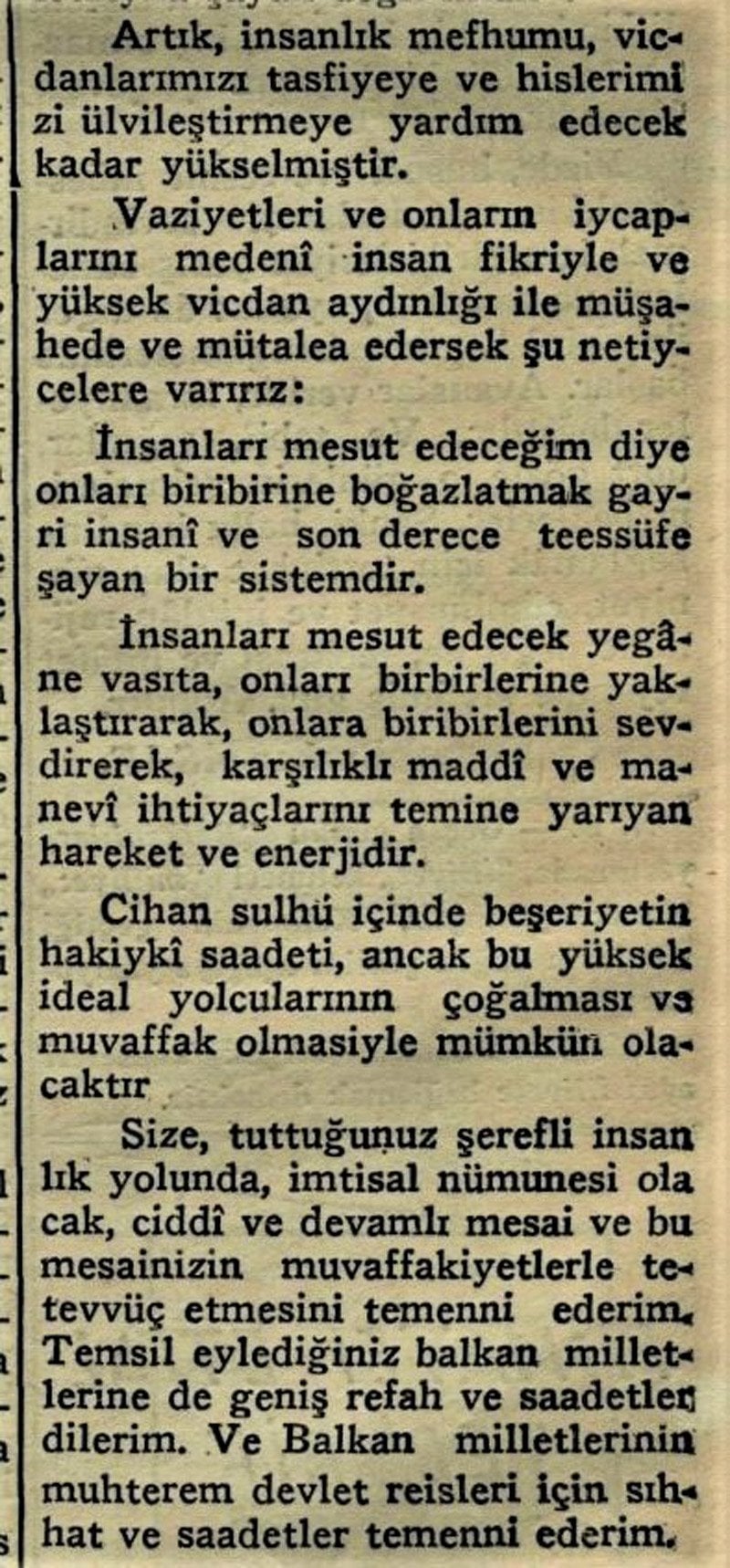 Atatürk, kalıcı barış için her şeyden önce insanlara birbirini sevdirmek gerektiğini düşünüyordu. 25 Ekim 1931’de Balkan Konferansı üyelerine şöyle demişti: “İnsanları mesut edeceğim diye onları birbirine boğazlatmak, insanlıktan uzak ve son derece üzünülecek bir sistemdir. İnsanları mesut edecek tek araç, onları birbirlerine yakınlaştırarak, onlara birbirlerini sevdirecek, karşılıklı maddi ve manevi ihtiyaçlarını temine yarayan hareket ve enerjidir. Dünya barışı içinde insanlığın gerçek mutluluğu, ancak bu yüksek ideal yolcularının çoğalması ve başarılı olmasıyla mümkün olacaktır.” (ASD, C.2, Ankara, 1997, s. 306)