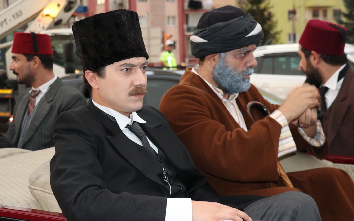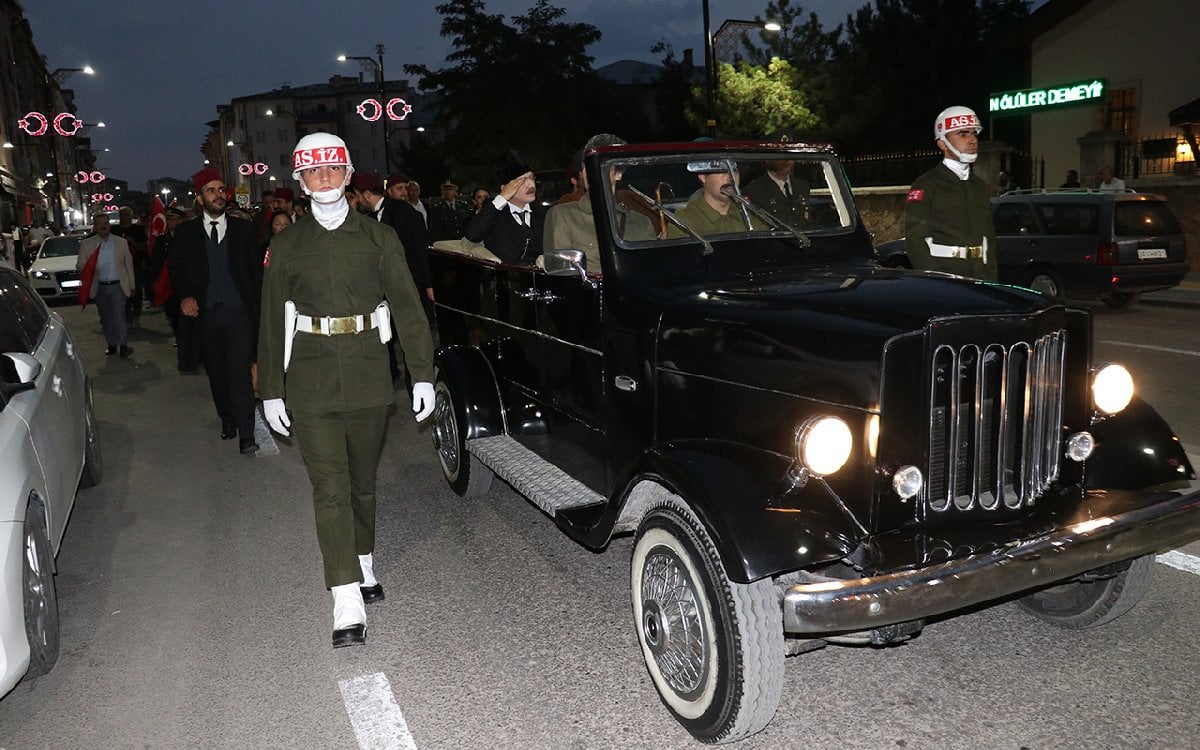 Atatürk'ü canlandıran Devlet Tiyatrosu oyuncusu Abdülsamet Sünbül, üstü açık arabayla güzergah boyunca halkı selamladı.