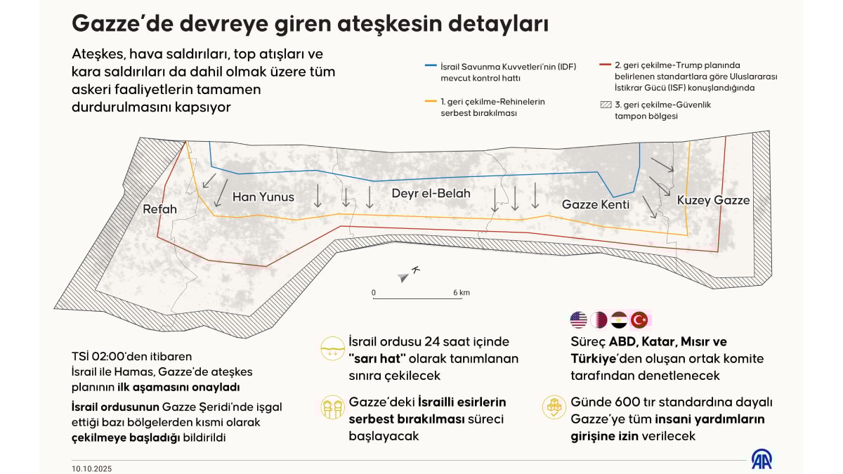 İsrail ordusu ateşkesin saat 12 itibariyle resmen başladığını duyurdu. İsrail ordusu, “Saat 12:00'den itibaren İsrail ordusu birlikleri, ateşkes anlaşması ve rehinelerin geri dönüşü için hazırlık amacıyla güncellenen konuşlanma hatları boyunca konumlanmaya başladı” dedi.