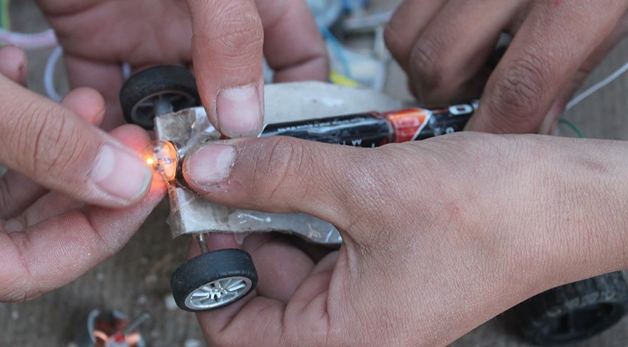 Hazır oyuncaklara bakıp kendi malzemeleriyle aynısını yapmaya çalıştıklarını dile getiren Daşdemir, ‘’ Beraber atık malzemeler toplayıp burada kendimize oyuncak araba yapıyoruz. Daha önce de birkaç tane yaptık. Mesela kullanılmayan ve eskimiş oyuncak arabanın tekerleklerini çıkarıp kartondan yaptığımız bu arabaya taktık. Yaptığımız arabanın içine bir de ışığı yanıp sönebilen küçük bir lamba takıyoruz. Pillerle sabitleştirip bir de düğme takıyoruz. Böylece ışığı yakıp söndürebiliyoruz’’ şeklinde konuştu.