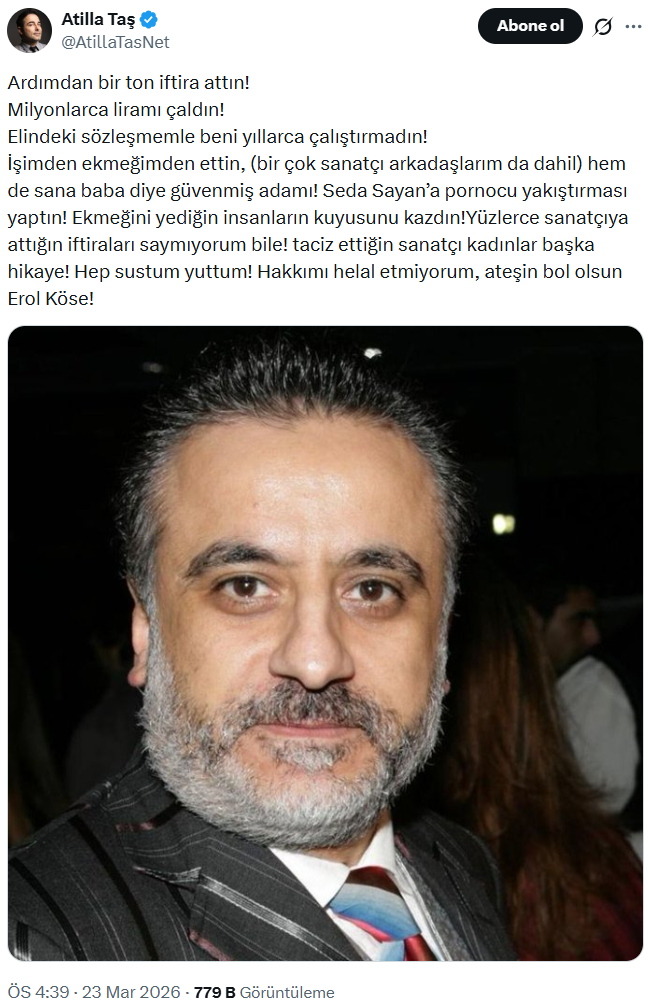 Yüzlerce sanatçıya attığın iftiraları saymıyorum bile! taciz ettiğin sanatçı kadınlar başka hikaye! Hep sustum yuttum! Hakkımı helal etmiyorum, ateşin bol olsun Erol Köse!"