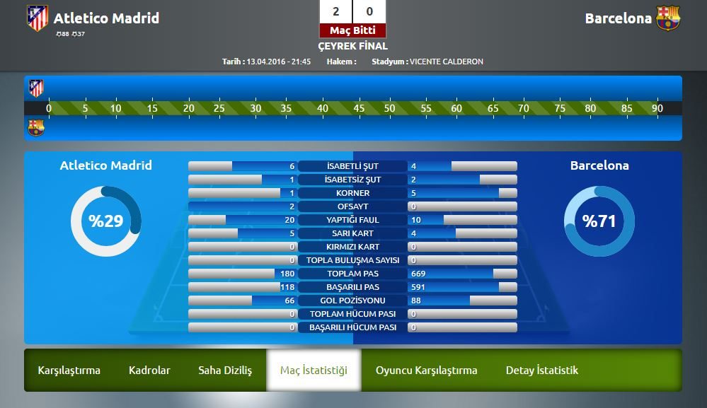 Şampiyonlar Ligi çeyrek final rövanş maçında Atletico Madrid ile Barcelona karşı karşıya geldi. Vicente Calderon’da oynanan mücadeleyi Atletico 2-0 kazanarak Barça’yı kupanın dışına itip yarı finale yükseldi. İlk maçta Barcelona karşısında 1-0 öne geçip, Fernando Torres’in kırmızısıyla eksik kalan Atletico Madrid, ikinci yarıda rakibine direnemeyip 2-1 yenilmişti.