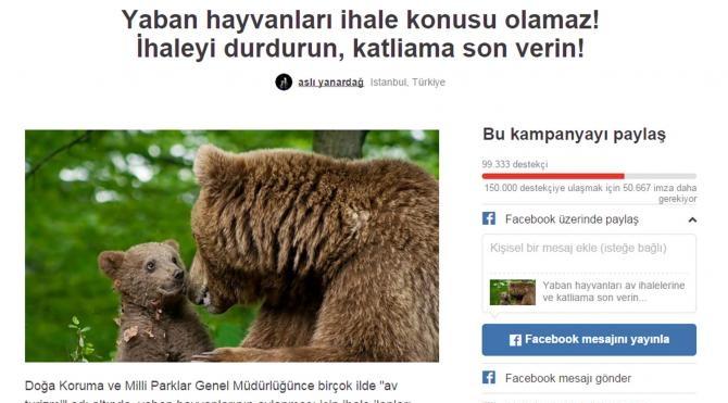 İmza kampanyası platformu `change.org` internet sitesi üzerinden sinema oyuncusu Arzu Yanardağ`ın kardeşi Aslı Yanardağ`ın başlattığı imza kampanyasına katılan kişilerin taleplerine yönelik hazırlanan dilekçe, her imzalayan kişi adına Başbakanlık ve Orman Su İşleri Bakanı Veysel Eroğlu ile bakanlığın ilgili birimlerine e-posta olarak da iletildi. `Av Turizmi katliamdır! İhaleyi durdurun ve katliama son verin` başlıklı dilekçelerde, yaban hayvanlarının hayatlarını ihale konusu haline getirmek ve bu masum hayvanların ölülerinden para kazanmanın insanlıkla ve vicdanla hiçbir şekilde bağdaşmadığı kaydedildi.