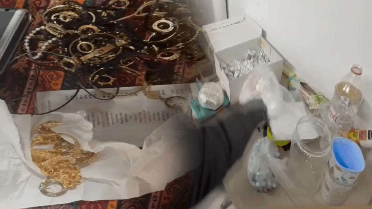 Şüphelilerin çaldıklarını sakladıkları evde polis ekipleri tarafından arama yapıldı. Aramalarda gasbedilen ziynet eşyaları ele geçirilirken, çok sayıda uyuşturucu madde ve uyuşturucu hapla, 3 tabanca ve çok sayıda mermi ele geçirildi. Arama sırasında bulunan ruhsatsız 3 tabanca, 472 gram kokain, 385 adet ecstasy uyuşturucu hap, 2 bin 240 adet uyuşturucu hapla, satışa hazır halde çok miktarda esrar ve 3 adet hassas teraziye el kondu.
