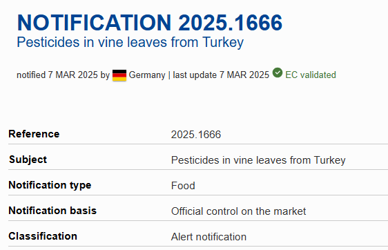 Avrupa Birliği Komisyonu'nun Gıda ve Yemler İçin Hızlı Alarm Sistemi'nde yer alan 2025.1666 no'lu bildirimde Türkiye'den Almanya'ya giden asma yapraklarının yoğun pestisit tespiti nedeniyle toplatıldığı ortaya çıktı.