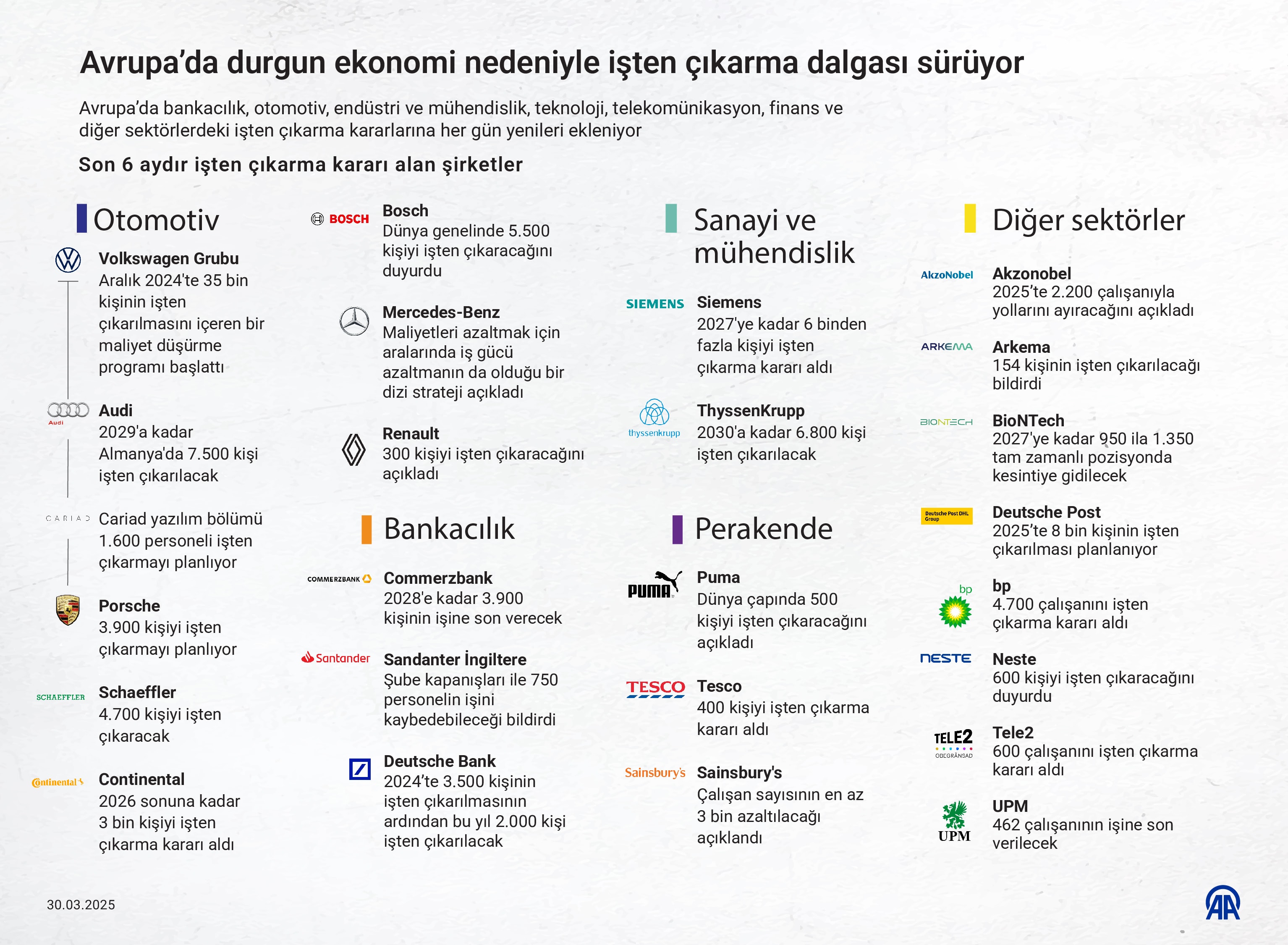 Avrupa'da bankacılık, otomotiv, endüstri ve mühendislik, teknoloji, telekomünikasyon, finans ve diğer sektörlerdeki işten çıkarma kararlarına her gün yenileri ekleniyor.