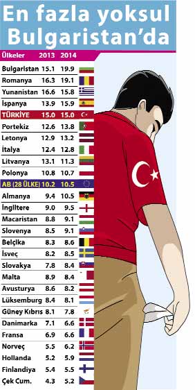 Türkiye yoksullluk sıralamasında 28 Avrupa ülkesi arasında ilk 5’e girdi. TÜİK’in hazırladığı Gelir Gelir ve Yaşam Koşulları Araştırması’nın sonuçlarına göre Türkiye’de medyan gelirin yüzde 50’si temelinde elde edilen yoksulluk oranı yüzde 15 seviyesinde kaldı. Bu oran Türkiye Avrupa ülkeleri arasında en fazla yoksula sahip 5’inci ülke olmasına neden oldu. Araşıtrmaya göre en fazla yoksulluk yüzde 19.9 ile Bulgaristan’da bulunurken, bu ülkeyi sırasıyla yüzde 19.1 ile Romanya, yüzde 15.8 ile Yunanistan, yüzde 15.9 ile İspanya, yüzde 15 ile Türkiye takip ediyor. Türkiye’de 2104’te de yoksulluk yüzde 15 oranındaydı.