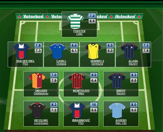 Galatasaray'ın FC Kopenhag'ı 3-1 mağlup ettiği karşılaşmada başarılı bir futbol ortaya koyan ve 1 de gol kaydeden Hollandalı yıldız UEFA tarafında haftanın 11'ie seçildi.Sneijder dışında kadroda Anderlecht'e 4 gol atan Ibrahimovic, CSKA Moskova'ya 2 gol atan Agüero ve Arsenal karşısında başarılı bir oyun ortaya koyan Dortmund'un stoperi Hummels yer aldı.