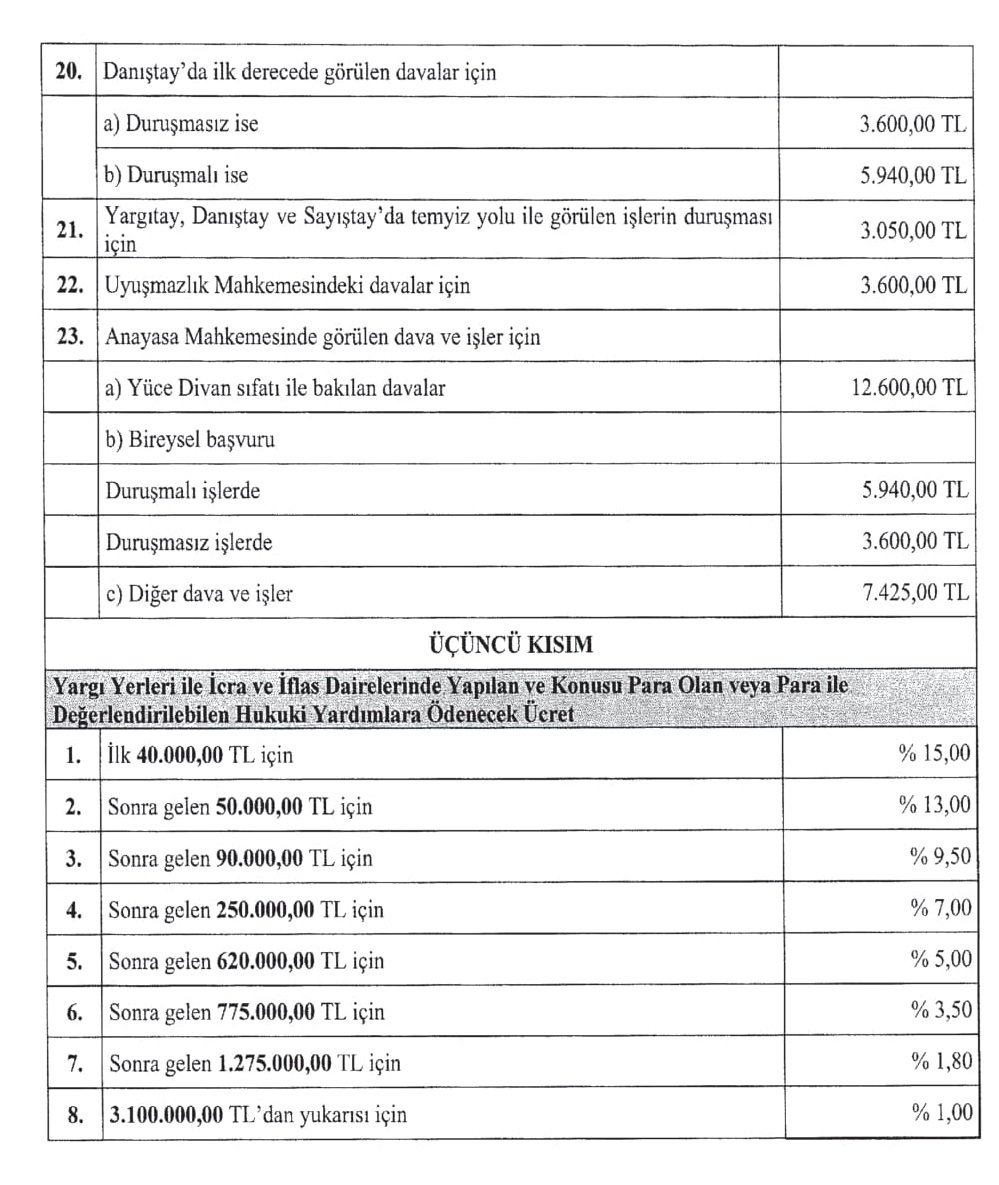 Avukatlara hukuki yardımlar, davalar, yürütülecek iş ve işlemler karşılığında ödenecek yeni ücretler belirlendi. Ortalama yüzde 20 zamlanan yeni avukatlık asgari ücret tarifesi bugün Resmi Gazete'de yayımlanarak yürürlüğe girdi.