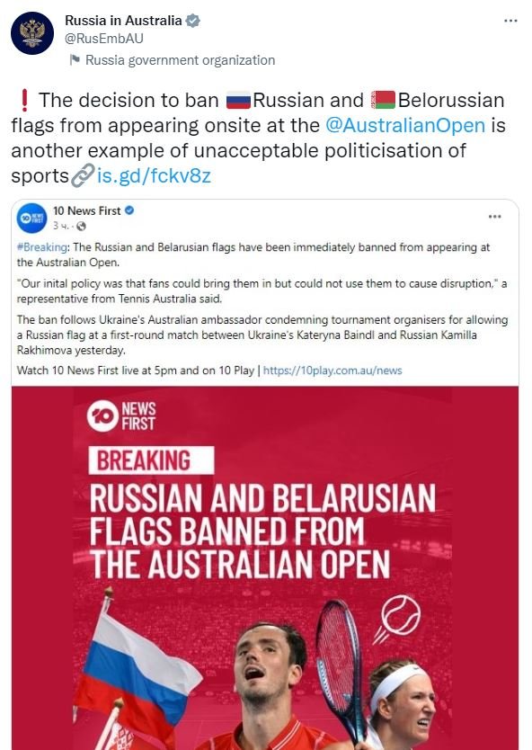 Avustralya'nın Melbourne kentinde devam eden Avustralya Açık 2023 Tenis Turnuvası sırasında dün kadınlar tekli ilk tur maçında karşı karşıya gelen Ukraynalı Kateryna Baindl ile Rus sporcu Kamilla Rakhimova maçı sırasında saha kenarında Rus bayrağı açıldı. Avustralya Tenis Otoritesi olarak görev yapan Tenis Avustralya, olayla ilgili "Avustralya Açık'ta Rusya ve Belarus bayrakları sahada yasaklandı. İlk kararımız taraftarların onları (bayrakları) getirebileceği, ancak karışıklığa neden olacak şekilde kullanamayacağı şeklindeydi. Dün saha kenarında bayrak açılması olayı yaşadık. Yasak hemen yürürlüğe girecektir. Tenisin tadını çıkarmak için mümkün olan en iyi ortamı sağlamak için oyuncular ve taraftarlarımızla çalışmaya devam edeceğiz" ifadelerini kullandı.