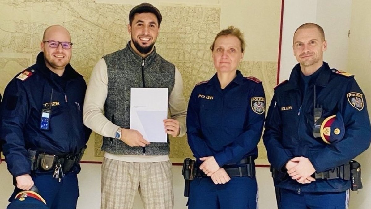 Viyana Emniyet Müdürlüğünün resmi sosyal medya hesabından, başkentin 18’inci bölge komiserlerinden Christian Sandner’in Dağ’a teşekkür belgesini verirken çekilen görüntüleri paylaşıldı.