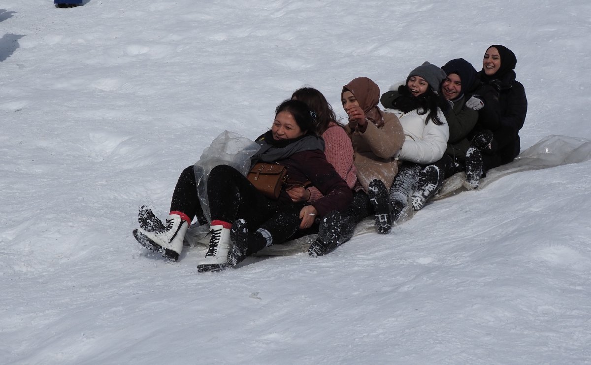 Vatandaşlar yanlarında getirdikleri muşambalar, naylon poşetler, çöp poşetleri ve şambrelleri ellerine alarak festival alanının bulunduğu tepenin en üst kısmına kadar taşıyarak karlı kaplı yamaçtan aşağıya kayıyor.