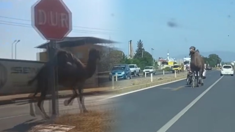 O anları çevredekiler cep telefonu kamerasıyla kaydetti. Görüntülerde devenin, akan trafikte ilerlediği ve hemen arkasından da sahibinin motosikletle gittiği anlar yer alıyor.