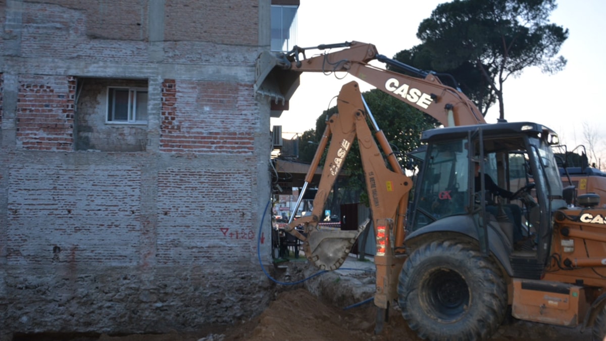 Durumu fark eden iş makinası operatörü, kepçeyi 4 katlı binanın duvarına dayayarak önlem aldı.