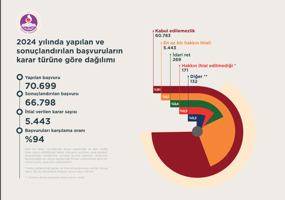 AYM'nin 2024 yılında incelediği 70 bin 699 başvurudan 66 bin 798'i sonuçlandı. Bu dosyalar içinde hak ihlali kararı verilen dosya sayısı 5 bin 443 oldu.