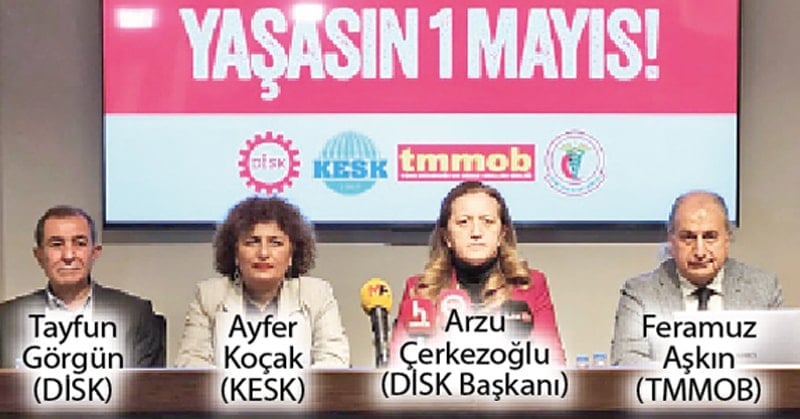 Sendika ve meslek odalarının ortak basın açıklamasını okuyan DİSK Genel Başkanı Arzu Çerkezoğlu, İstanbul’daki 1 Mayıs kutlamalarını tarihsel ve sınıfsal olarak işçi sınıfının 1 Mayıs alanı olan Taksim Meydanı’nda yapmak üzere gerekli başvuruları yaptıklarını söyledi.