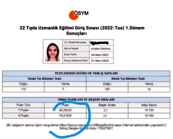Özkiraz'ın ÖSYM adı altında hazırladığı sahte TUS sonuç belgesinde Temel Tıp Bilimleri Testi'nde 115 doğru, 5 yanlış, Klinik Tıp Bilimleri Testi'nde ise 107 doğru 12 yanlış yazıp kendisini üstün başarılı olarak göstermeye çalıştığı fotoğraflar da yer aldı.