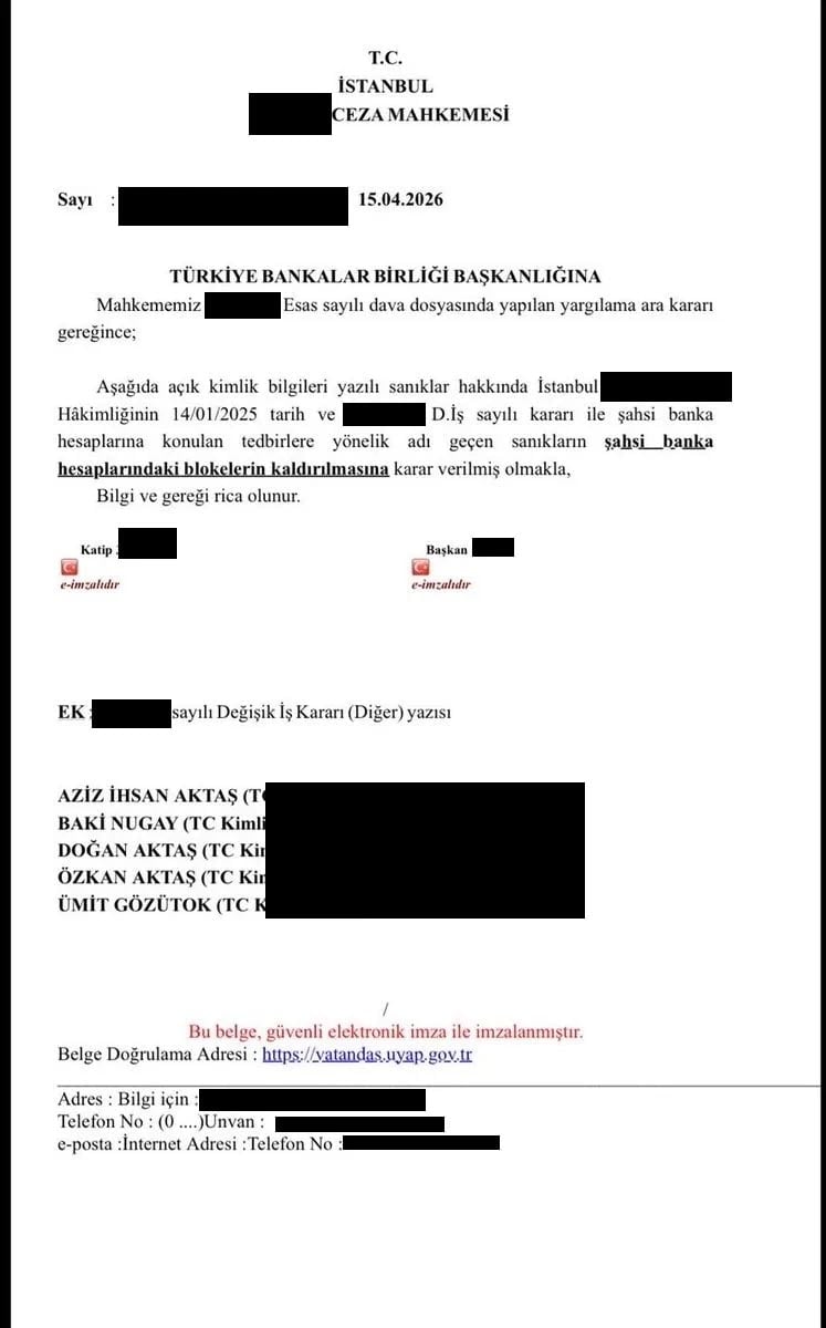 Yarın ikinci duruşması görülecek dava öncesinde, Aktaş’ın yanı sıra Baki Nugay, Doğan-Özkan Aktaş ve Ümit Gözütok’un bireysel hesaplarındaki blokenin kaldırıldığı ortaya çıktı.