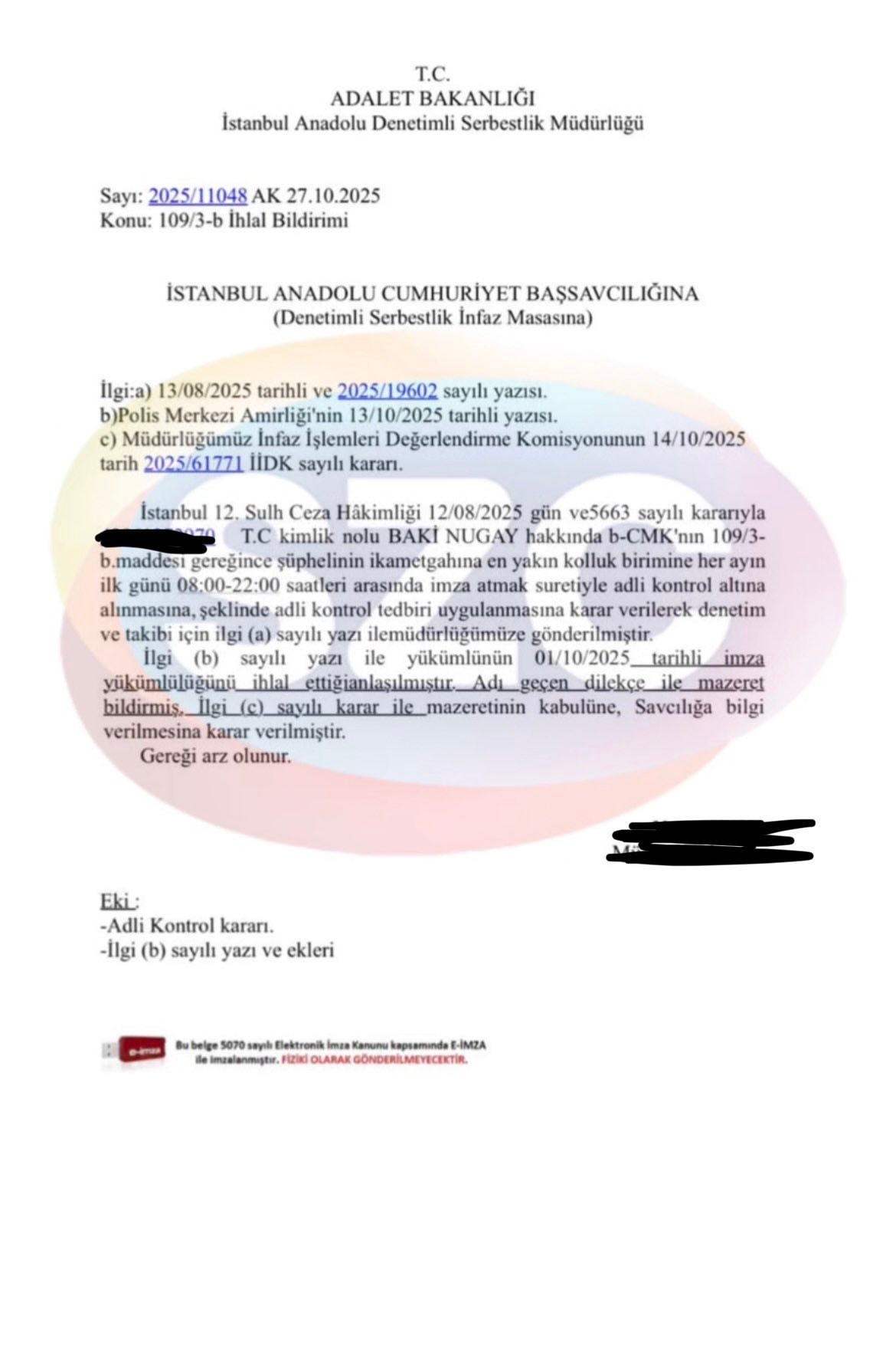 Baki Nugay’ın her ayın ilk günü karakola imza şartıyla adli kontrol tedbiri altına alınmıştı. Ancak Nugay’ın 01/10/2025 tarihinde karakola imza vermediği ve mazeret bildirdiği ortaya çıktı. Denetimli Serbestlik Müdürlüğü’nün de Nugay’ın mazeretini kabul ettiği anlaşıldı.