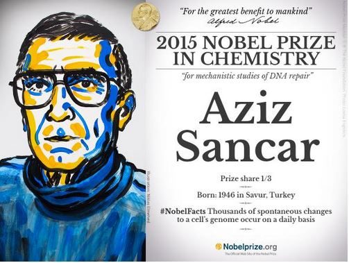 Dünyanın en saygın bilim ödülüne bir Türk bilimadamı da sahip oldu. 2015 Nobel Kimya ödülü aralarında Türk bilim insanının da bulunduğu 3 kişiye verildi. Bu yıl ki Nobel Kimya ödülü; Aziz Sancar, Thomas Lindahl ve Paul Modrich’e verildi. Aziz Sancar, Lindahl ve Modrich; 2015 Nobel Kimya Ödülü'nü, hücrelerin hasar gören DNA'ları nasıl onardığını ve genetik bilgisini koruduğunu haritalandıran araştırmaları sayesinde kazandı. Peki Aziz Sancar kimdir?