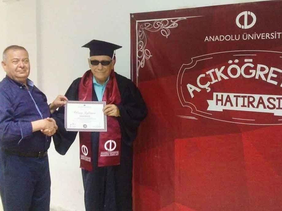 Denizli'de yaşayan Azmi Ermiş (72), 1966’da öğretmen okulundan mezun oldu. İlk görev yeri Sivas Divriği’de bir köy okuluydu. Köyün ilk öğretmeniydi. Kereste getirtip okulun sıralarını yaptırdı. Ardından Emirdağ ve Şuhut’ta öğretmenliğe devam etti. 25 yaşında Behçet hastası olduğunu öğrendi. Hastalığı nedeniyle görme yetisini kaybedince malulen emekli edildi. Hayata ise eğitimle tutundu. Ermiş, bu süreçte üniversitede sosyoloji, adalet ve yerel yönetimler bölümlerini bitirdi. Şimdi ise medya ve iletişim bölümünde okuyor. Ders çalışırken eşine yardım eden Suzan Ermiş, “Ben ona göz, o bana ışık oluyor” dedi.