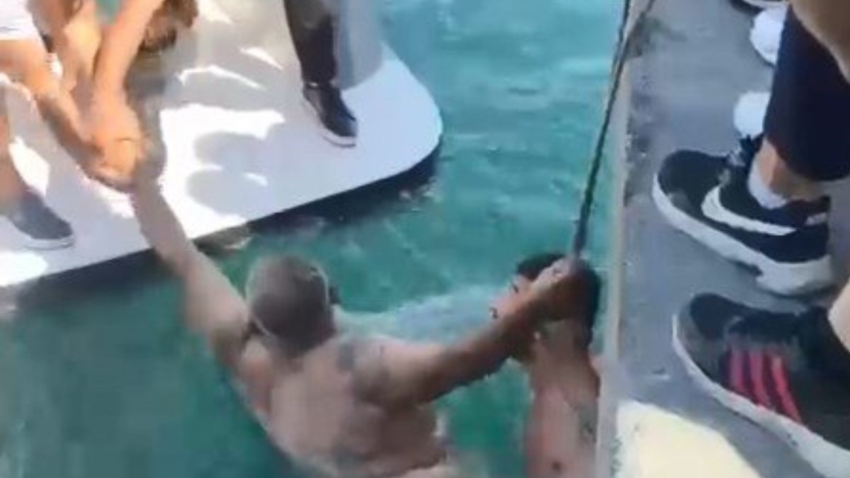 Görüntülerde ayrıca, teknenin yaklaşarak boğulma tehlikesi geçiren adamı alması, boğulma tehlikesi geçiren adamı kurtarmak için suya atlayan vatandaşın sudan çıktığı anda alkışlarla karşılanması yer alıyor. (DHA)