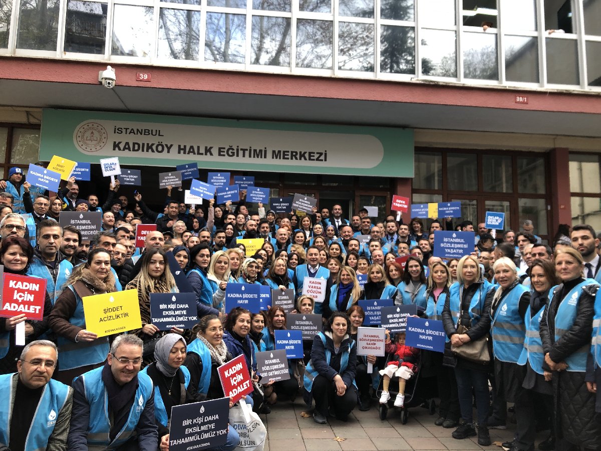 Yürüyüşe katılan kadınlar, “İstanbul Sözleşmesi yaşatır”, “İstanbul Sözleşmesi’ne sahip çıkacağız”, “Kadın varsa çözüm var”, “İstanbul Sözleşmesini geri getireceğiz”, “şiddet acizliktir” yazılı dövizler taşıdı.