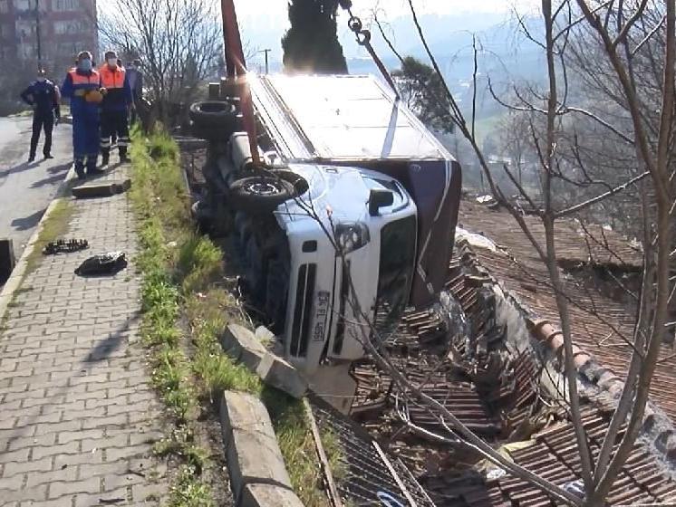 Gecekondunun çatısına uçan kamyonet olay yerine çağrılan vinç yardımı ile bulunduğu kaldırıldı. (İHA)