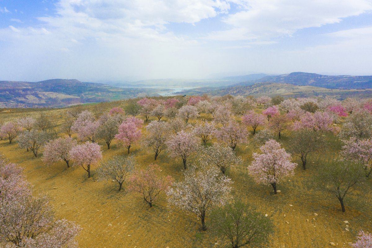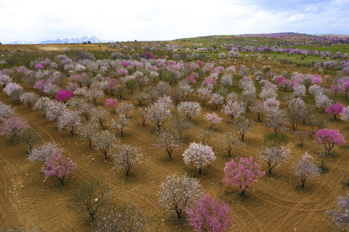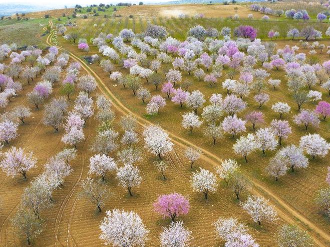 Yabanlı köyünde çiçek açan yerli badem ağaçları, dron pilotu Ali Körük tarafından görüntülendi.
