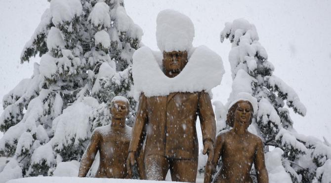 Hasan DAVRAN BAFRA (Samsun), (DHA) - SAMSUN`un Bafra İlçesi`nde kar yağışı hayatı olumsuz etkiledi. Kent merkezi beyaza bürünürken, Atatürk heykeli de karla kaplandı. Yurdu etkisi altına alan kar yağışı Samsun`un Bafra İlçesi`nde de etkisini sürdürdü. Kent merkezinde 30 santimi, yüksek kesimlerde ise bir metreyi aşan kar kalınlığı hayatı adeta felç etti. Bafra İlçesi Cumhuriyet Meydanı`nda bulunan Atatürk heykeli ise beyaza büründü. Ulu önder Mustafa Kemal Atatürk`ün heykelinin karlı görüntüsü vatandaşların da dikkatini çekti. Meydandan geçenler Atatürk`ün karlı fotoğrafını ölümsüzleştirmek için cep telefonları ile bu anı çekti. Samsun Büyükşehir Belediyesi ekipleri de il genelinde karla kapanan yolları açmak için çalışmalarını yoğun bir şekilde sürdürüyor. DHA