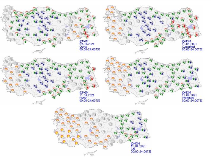 Meteoroloji Genel Müdürlüğü tarafından yapılan son değerlendirmelere göre: Ülkemiz genelinin parçalı ve çok bulutlu, Marmara’nın doğusu, Doğu Akdeniz, İç Anadolu (Sivas hariç), Batı ve Orta Karadeniz, Doğu Karadeniz kıyıları, Doğu Anadolu’nun doğusu ile Balıkesir, Uşak, Kütahya, Afyonkarahisar, Isparta, Artvin ve Siirt çevrelerinin yağışlı geçeceği tahmin ediliyor.