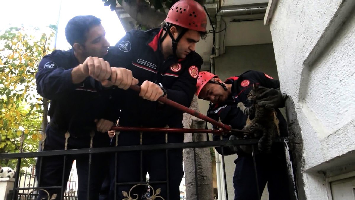 Kedi için 112'den yardım istendi. Sevk edilen itfaiye ekibindeki görevliler demir kesme makası ile kurtarma operasyonu başlattı. Bir görevli kediyi yakalarken, çırpınmasını önlemek için diğer bacağını da tuttu. İki görevli makas ile demir parmaklığı kesti.
