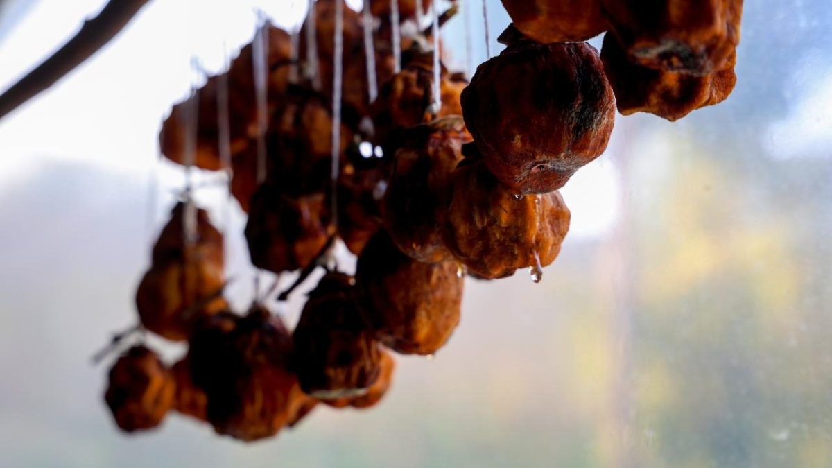 Henüz olgunlaşmadan meyveleri toplayan kadınlar, hurmaları soyarak iplerle odun sobasına asıyorlar.