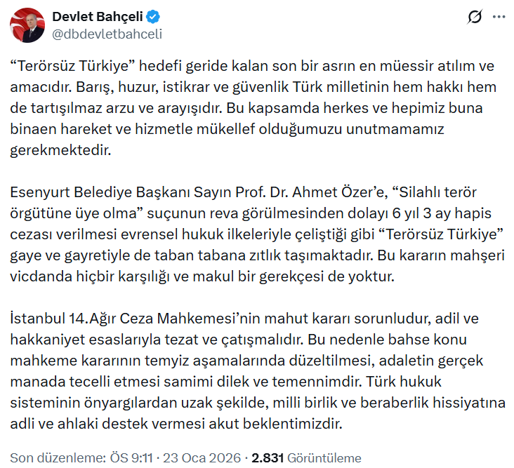 MHP Genel Başkanı Devlet Bahçeli, hakkında hapis cezası kararı verilen Ahmet Özer hakkında bir açıklamada bulundu.