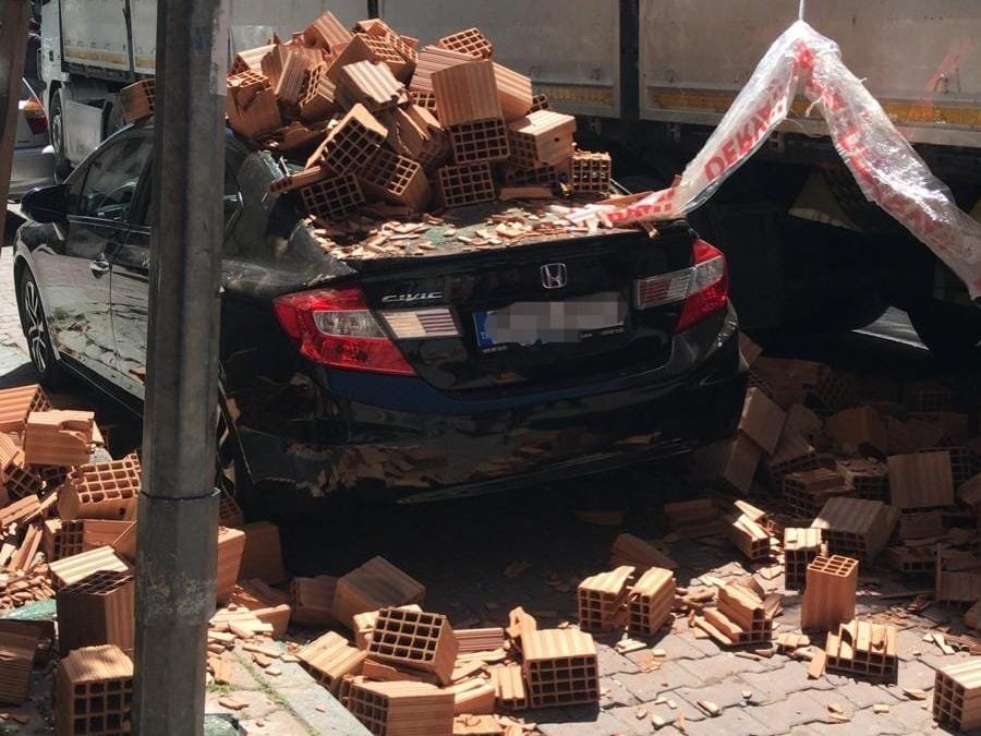 Bahçelievler'de inşaata indirilen tuğlalar otomobilin üzerine devrildi