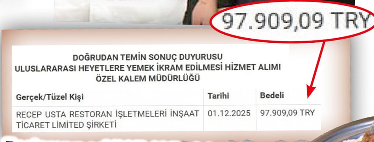 Son olarak KKTC’den gelen Çalışma ve Sosyal Güvenlik Bakanı Oğuzhan Hasipoğlu ile 12 kişilik heyet de meşhur Tavacı Recep Usta’da ağırlandı. Mekanda bir gecelik yemek için 97 bin 909 TL (yani 4.5 asgari ücret) fatura edildi. Yemeğe kaç kişinin katıldığı ise açıklanmadı. Bakanlığın Mayıs ayında Azerbaycan heyetine Recep Usta’da verdiği yemeğin maliyeti de 30 bin liraydı. Maliye Bakanı Mehmet Şimşek’in de Tavacı Recep Usta’ya gittiği kamuoyuna yansımıştı.
