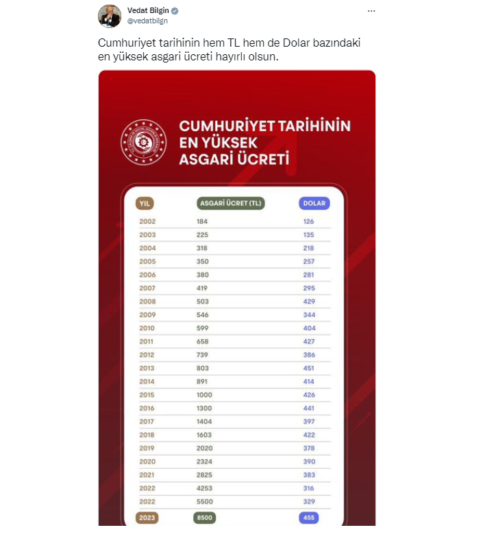 Bilgin, Twitter hesabından dün akşam yaptığı paylaşımda "Cumhuriyet tarihinin hem TL hem de Dolar bazındaki en yüksek asgari ücreti hayırlı olsun" mesajıyla birlikte 2002-2022 dönemine ilişkin asgari ücretin TL ve dolar cinsi değerlerinin yer aldığı tabloya yer verdi.