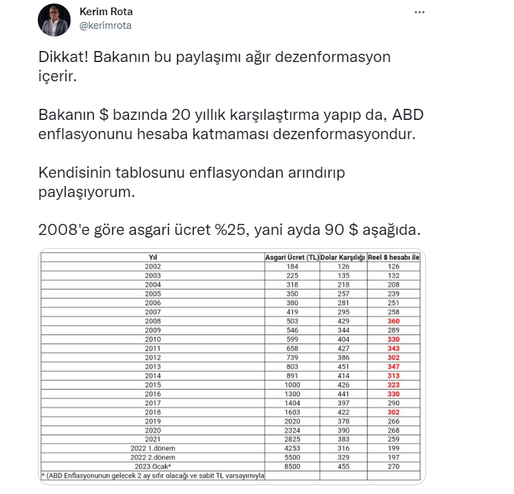 "Dikkat! Bakanın bu paylaşımı ağır dezenformasyon içerir" diyen eski bankacı Rota, "Bakanın dolar bazında 20 yıllık karşılaştırma yapıp da, ABD enflasyonunu hesaba katmaması dezenformasyondur. Kendisinin tablosunu enflasyondan arındırıp paylaşıyorum" dedi ve şu bilgiye yer verdi: "2008'e göre asgari ücret yüzde 25, yani ayda 90 dolar aşağıda."
