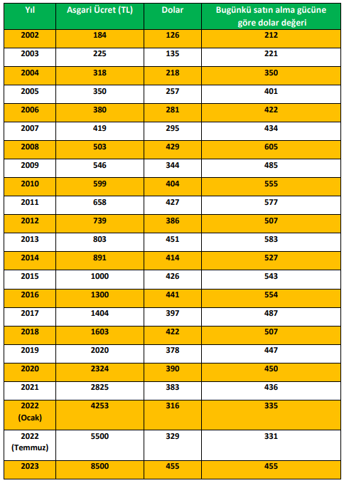 Bilgin'in paylaştığı tabloda, geçmiş yılların asgari ücretlerinin dolar karşılığı hesaplanırken, ilgili yılın ilk işlem günlerindeki dolar kurları, 2023 yılı için dünkü dolar kuru kullanıldı.