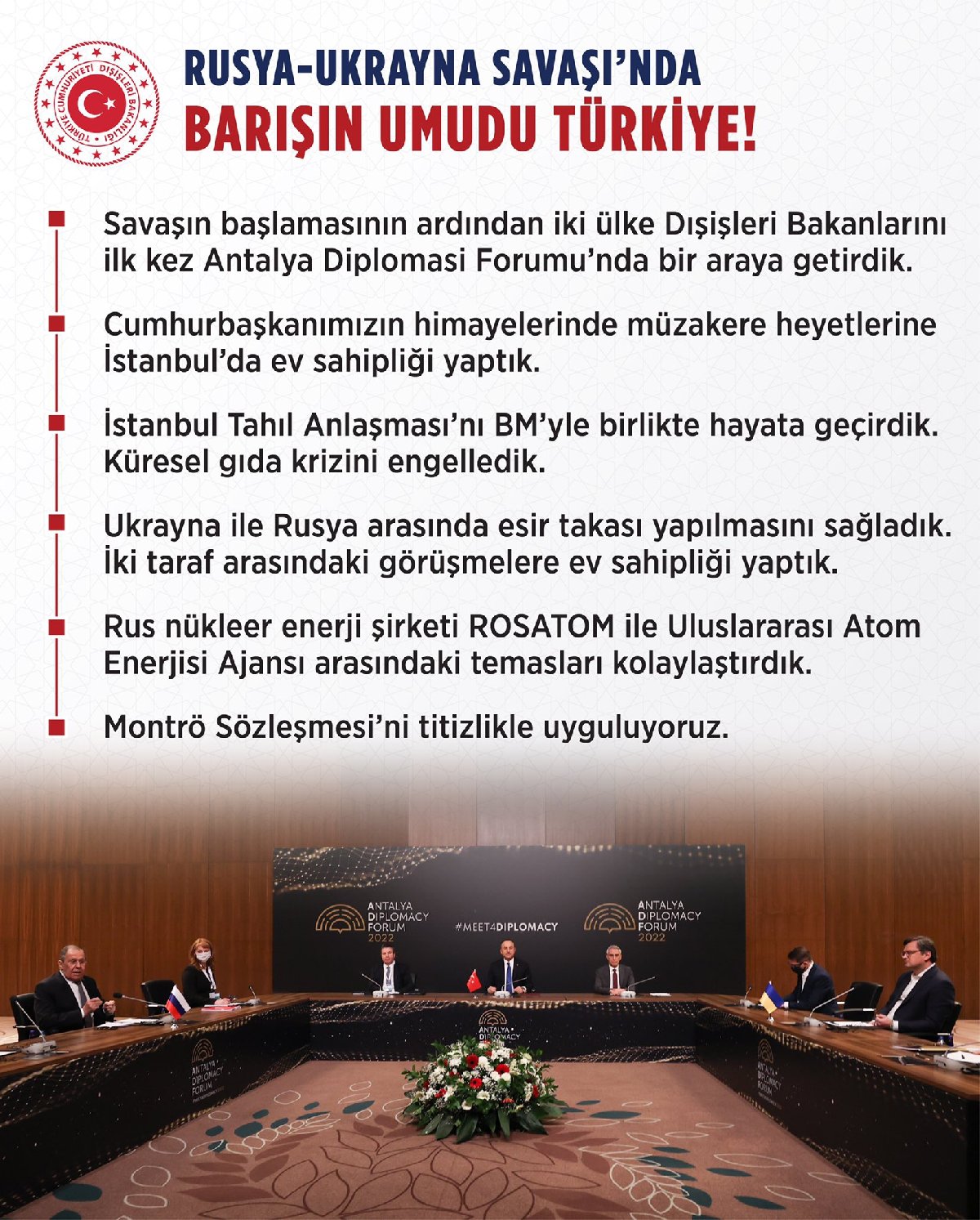 Çavuşoğlu, Ukrayna ile Rusya arasında esir takası yapılmasını sağladıklarını ve Rusya Devlet Atom Enerjisi Kurumu (ROSATOM) ile Uluslararası Atom Enerjisi Ajansı (UAEA) arasındaki temasları da kolaylaştırdıklarını bildirdi. Bakan Çavuşoğlu, Montrö Sözleşmesi'ni titizlikle uyguladıklarını belirtti. (AA)