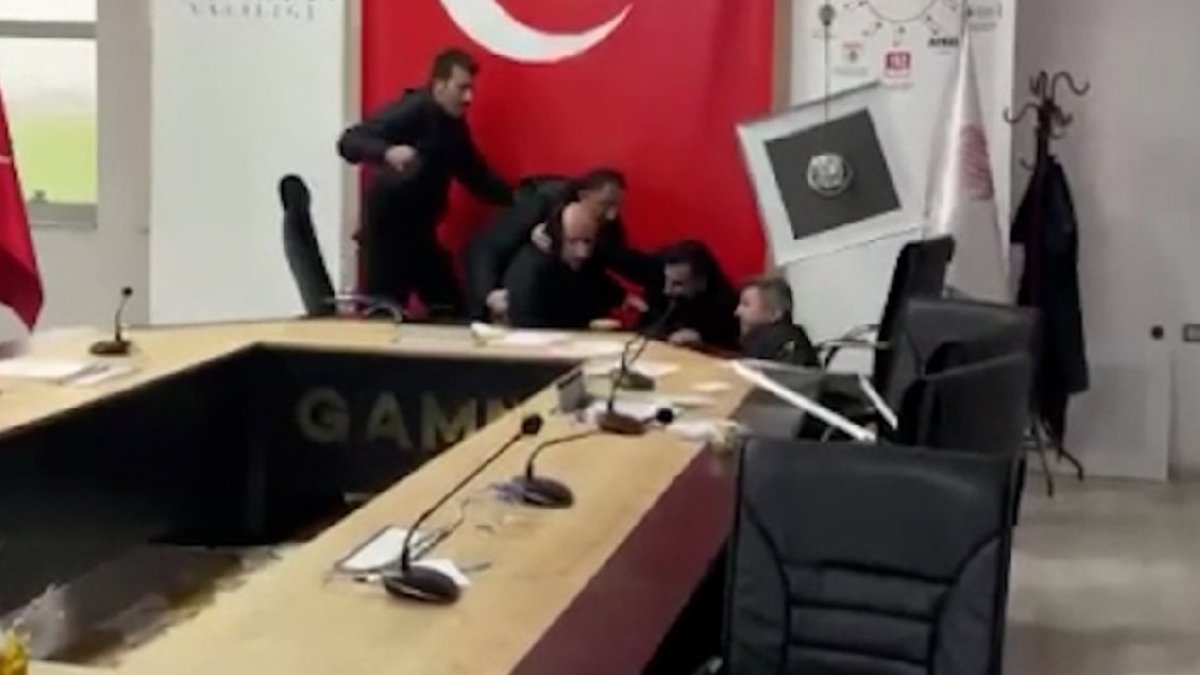 Depremin hissedilmesiyle masanın altına giren Karaismailoğlu ve diğer ilgililer, sarsıntının sona ermesiyle binadan ayrıldı. (AA)