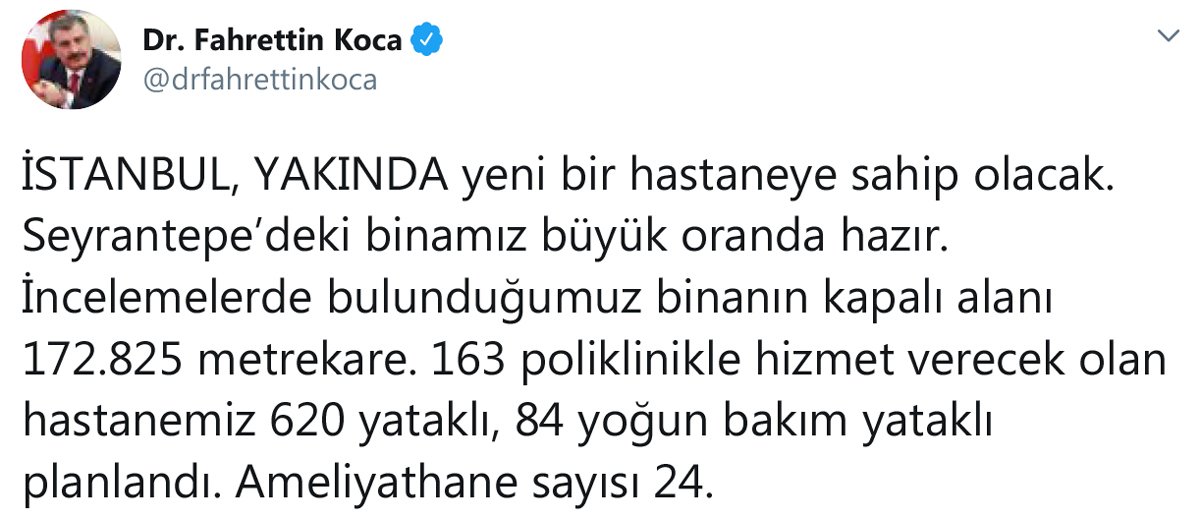 Sağlık Bakanı Fahrettin Koca, Twitter hesabından İstanbul'un yakında yeni bir hastaneye sahip olacağını belirtti.
