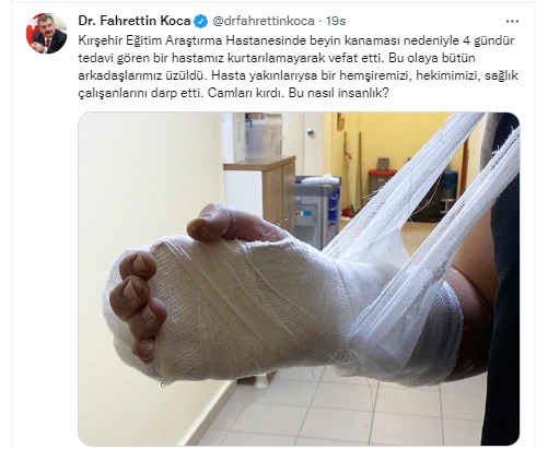 Sağlık çalışanları ve hekimlere yönelik şiddeti “Kırşehir Eğitim Araştırma Hastanesinde beyin kanaması nedeniyle 4 gündür tedavi gören bir hastamız kurtarılamayarak vefat etti. Bu olaya bütün arkadaşlarımız üzüldü. Hasta yakınlarıysa bir hemşiremizi, hekimimizi, sağlık çalışanlarını darp etti. Camları kırdı. Bu nasıl insanlık?” ifadeleriyle paylaşan Koca’ya, hekimler ve sağlık çalışanları tepki gösterdi.