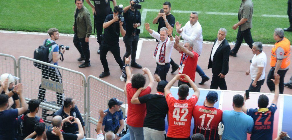 Bakan Nebati’nin yuhalandığı Mersin Stadyumu’nda maçtan sonra inerek taraftarları selamlayarak şampiyonluk sevincine ortak olan CHP’li Büyükşehir Belediye Başkanı Vahap Seçer, büyük ilgi gördü.