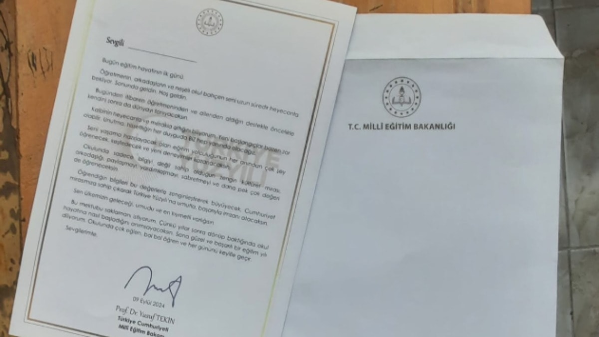 Altın varaklı kağıtlara basılan mektuplar zarf içinde dağıtıldı. Bakan Yusuf Tekin mektupta öğrencilere “Okulunda sadece bilgiyi değil sahip olduğun zengin kültürel mirası, arkadaşlığı paylaşmayı, yardımlaşmayı, sabretmeyi ve daha pek çok değeri de öğreneceksin. Öğrendiğin bilgiler bu değerlerle zenginleşerek büyüyecek” diye seslendi.
